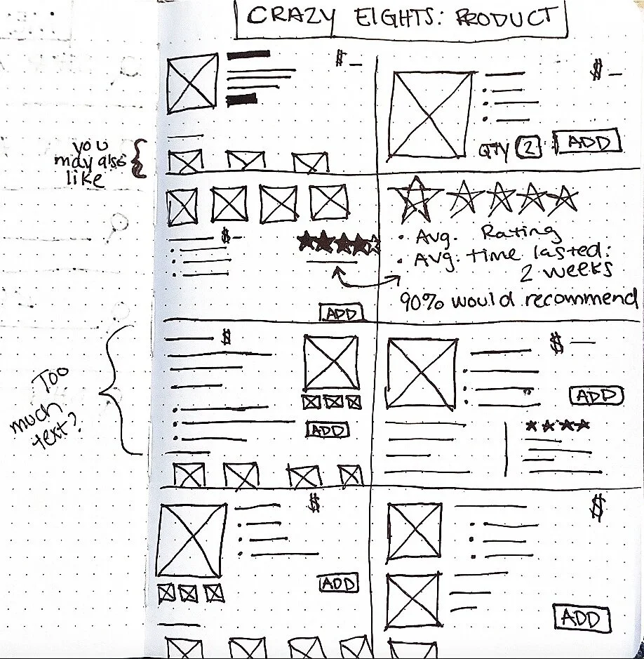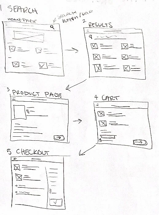 I began developing user stories with a loose structure in mind that I had developed from my sketching process. Shown here are a couple examples of user stories I came up with. Identifying the steps in a process helps to further work out the details of how this site will start to shape out and identify any branching paths that may exist. I tried to keep standard flows of what a typical web user is used to, while making sure to include details that a user would be most interested in. For example, in the purchase user story I made sure to include an order summary through every step of the cart, to checkout, to order confirmation page so the user is always aware and assure that their order is correct.