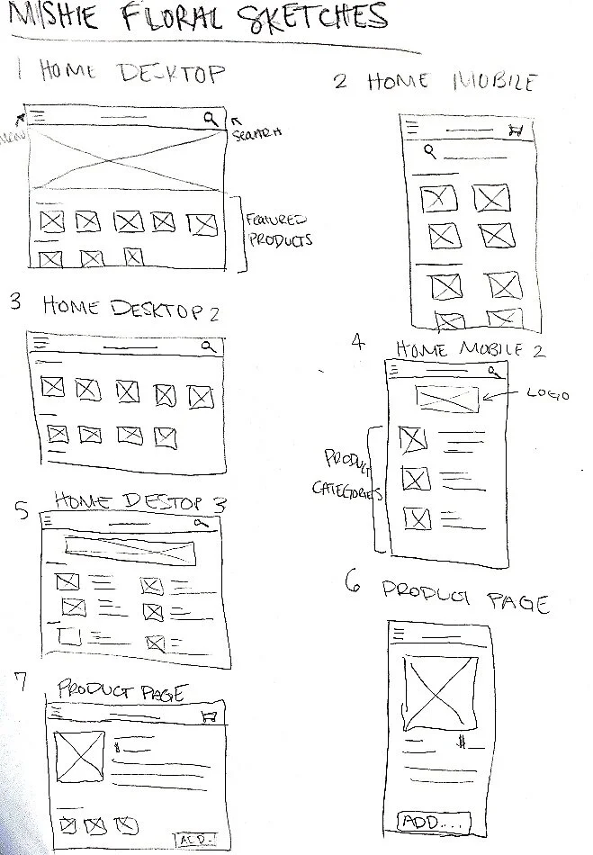 I looked back on my sketches and user stories to try to identify all of the pages needed and build a sitemap for Mishie Floral. I caught pages that I had forgotten about and identified some issues in my sketching. Those discoveries allowed me to iterate on my sketches and user stories in order to make them better.